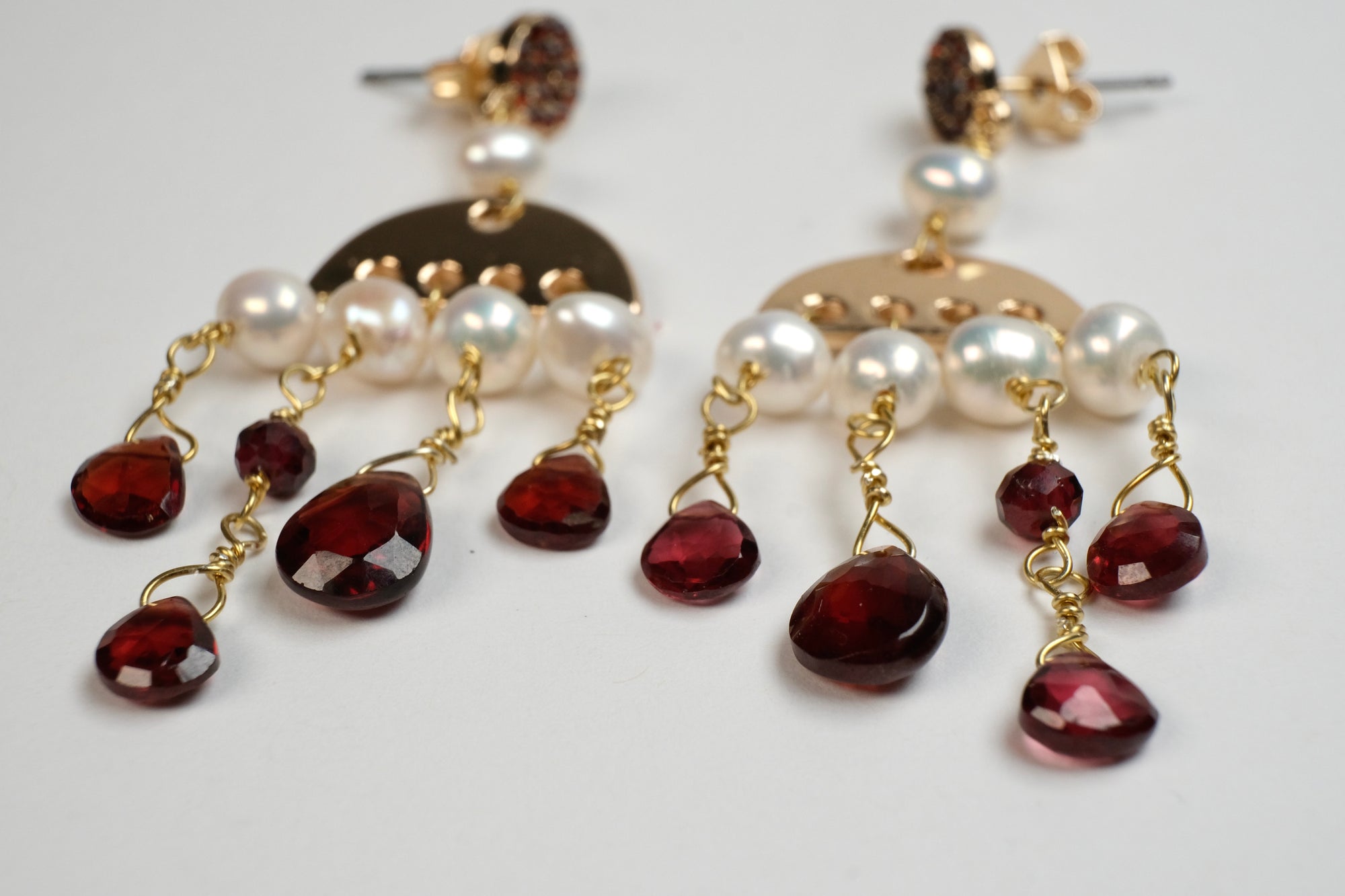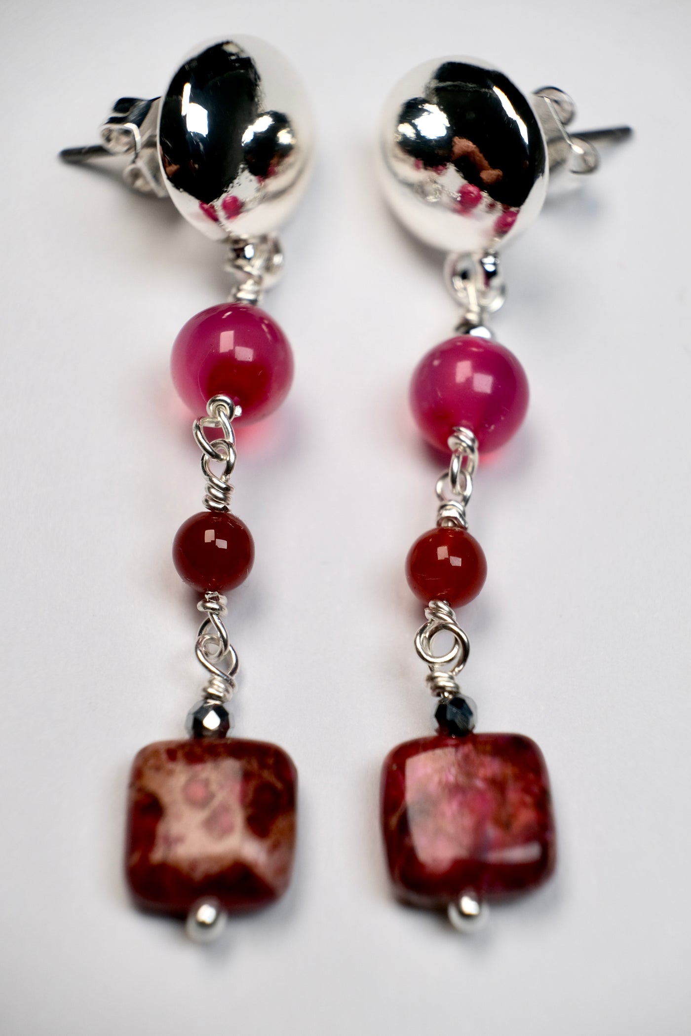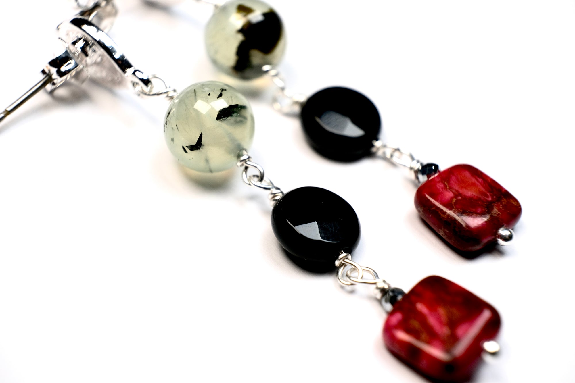 The three-stone earrings are made of natural stone, and I designed the selection of stones myself