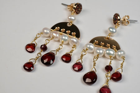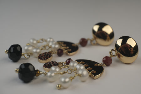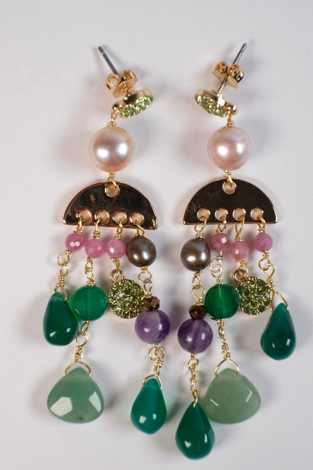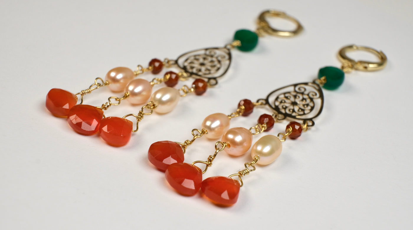 Chandelier model earrings with semi precious stones with threads and gold plated wire and hooks