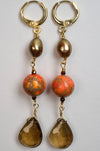 Earrings with semi-precious stones, citrine quartz, jasper, and pearl. Gold plated